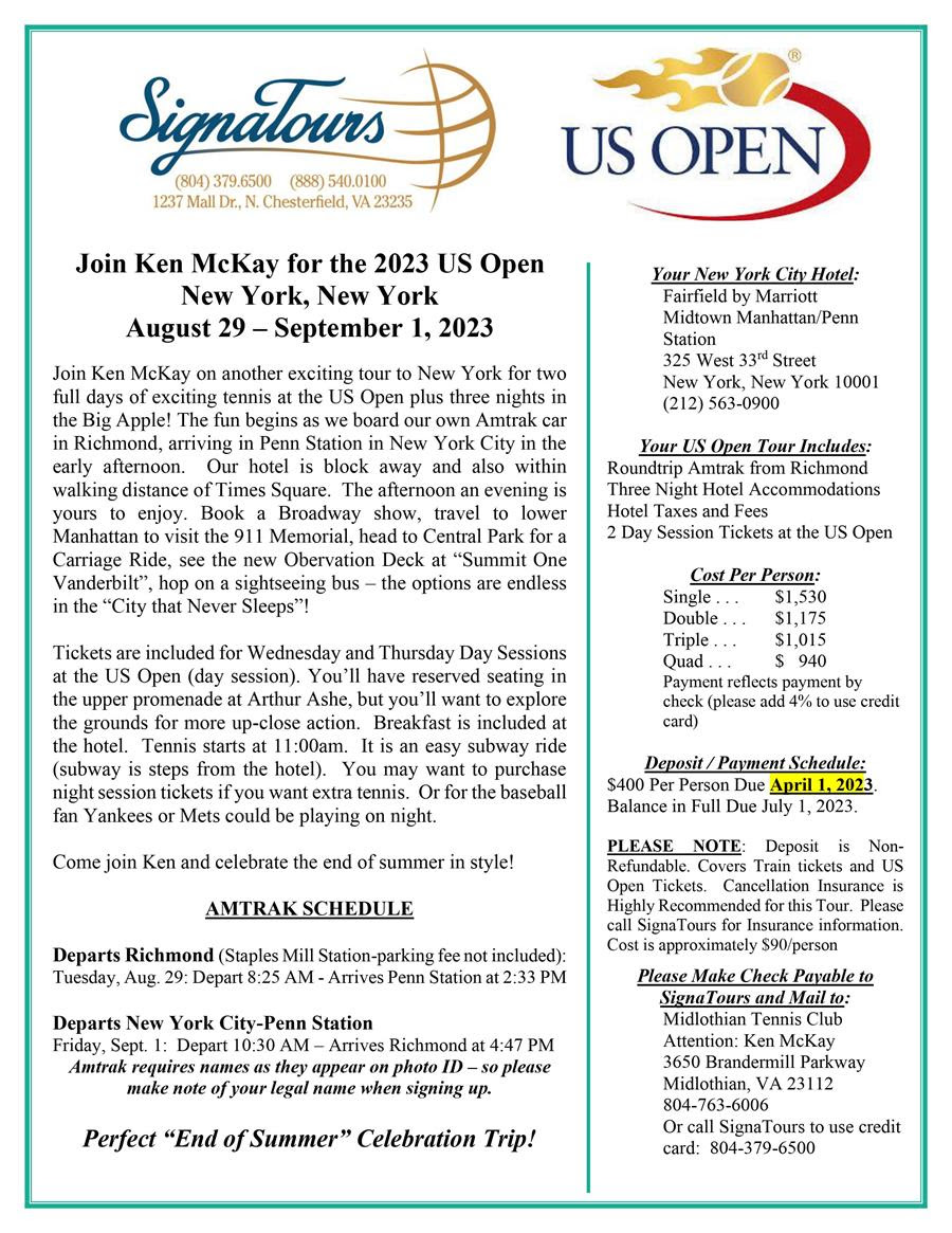 US Open Trip! 02/16/202302/16/2023 Reserve your spot for this awesome trip!We’re hoping to get commitments by March 15th.Check the flyer for pertinent info.